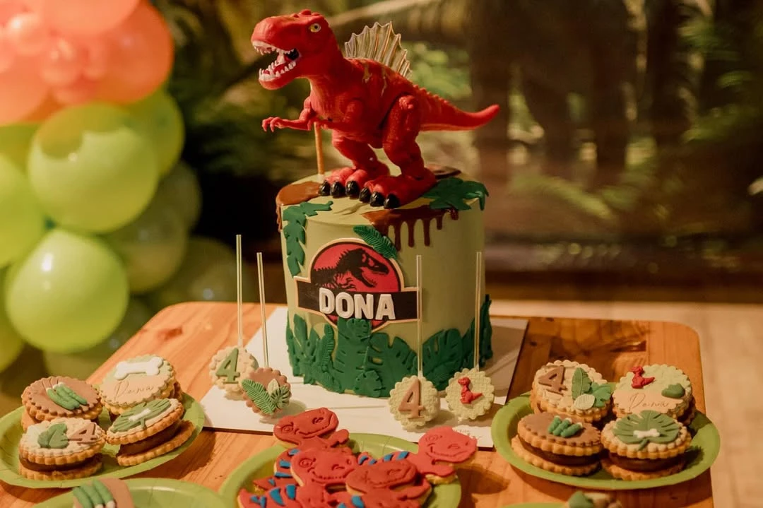 Como se puede ver en las imágenes, los invitados recibieron cajas sorpresa y vasitos verdes con figuras de dinosaurios. Por su parte, la torta tuvo el reconocido logo de Jurassic Park, la película de dinosaurios, con una gran figura de Tiranosaurio Rex.