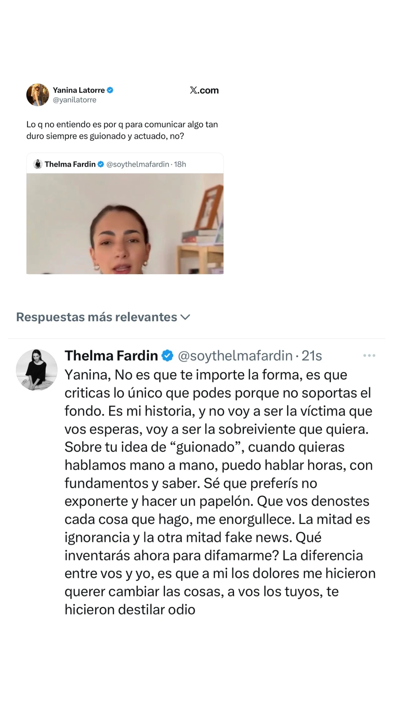 Ante este comentario, Fardín no lo dejó pasar y le salió directo al cruce. "Yanina, no es que te importe la forma, es que criticás lo único que podés porque no soportás el fondo. Es mi historia, y no voy a ser la víctima que vos esperás, voy a ser la sobreviviente que quiera", disparó la ex integrante de Patito Feo.