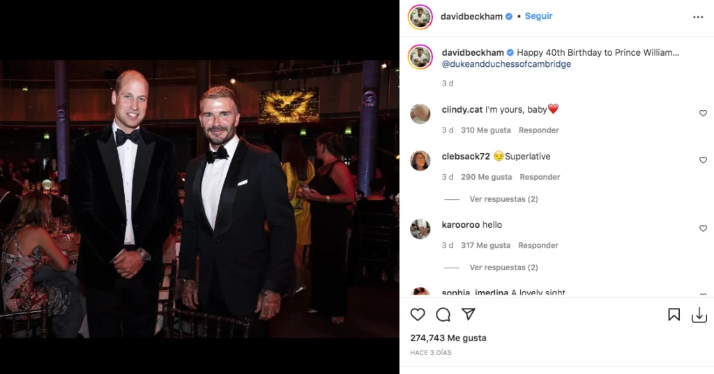 “Felices 40 años del Príncipe William”, escribió Beckham en su posteo en Instagram que de inmediato se ganó miles de likes y cientos de comentarios de personas que se unieron para felicitar al duque por su cumpleaños.