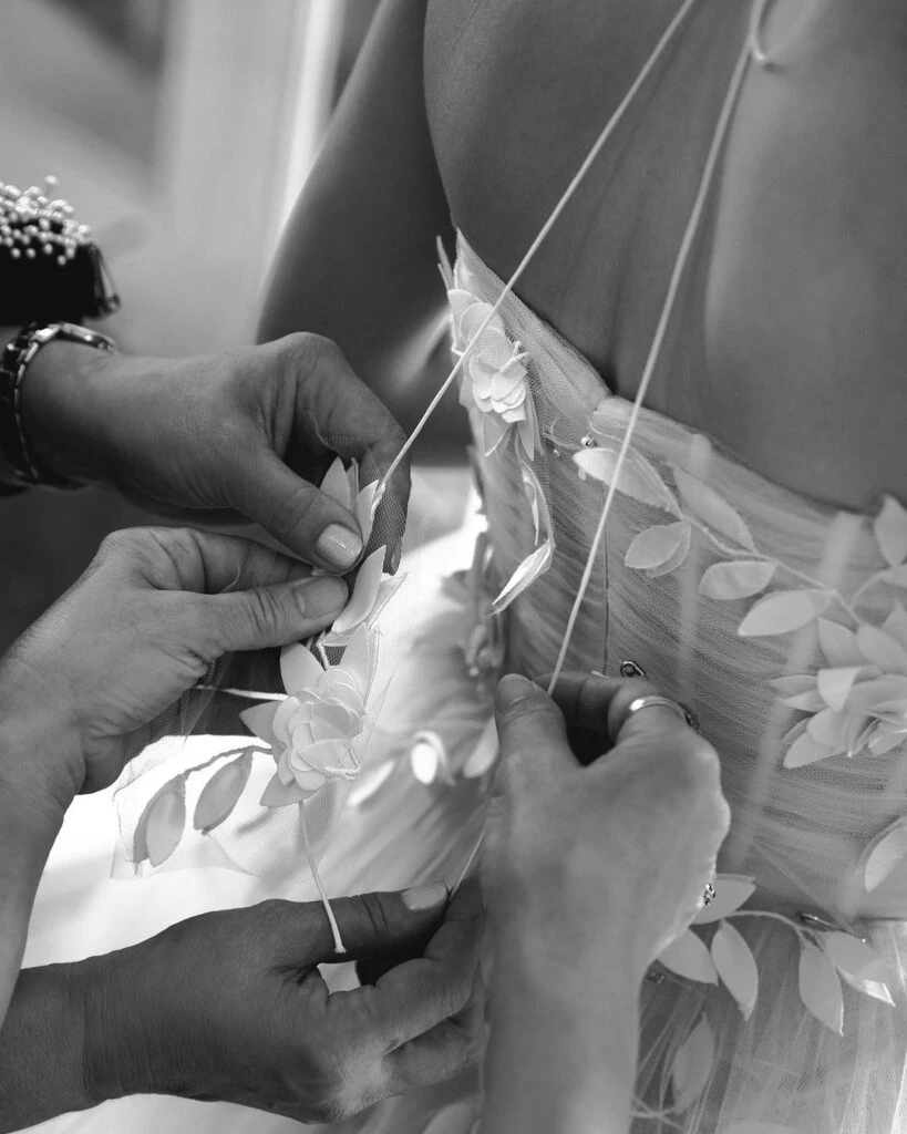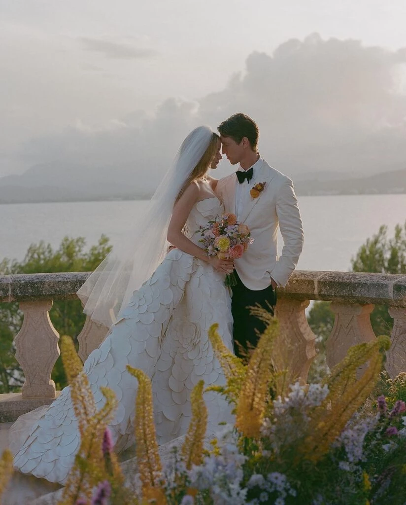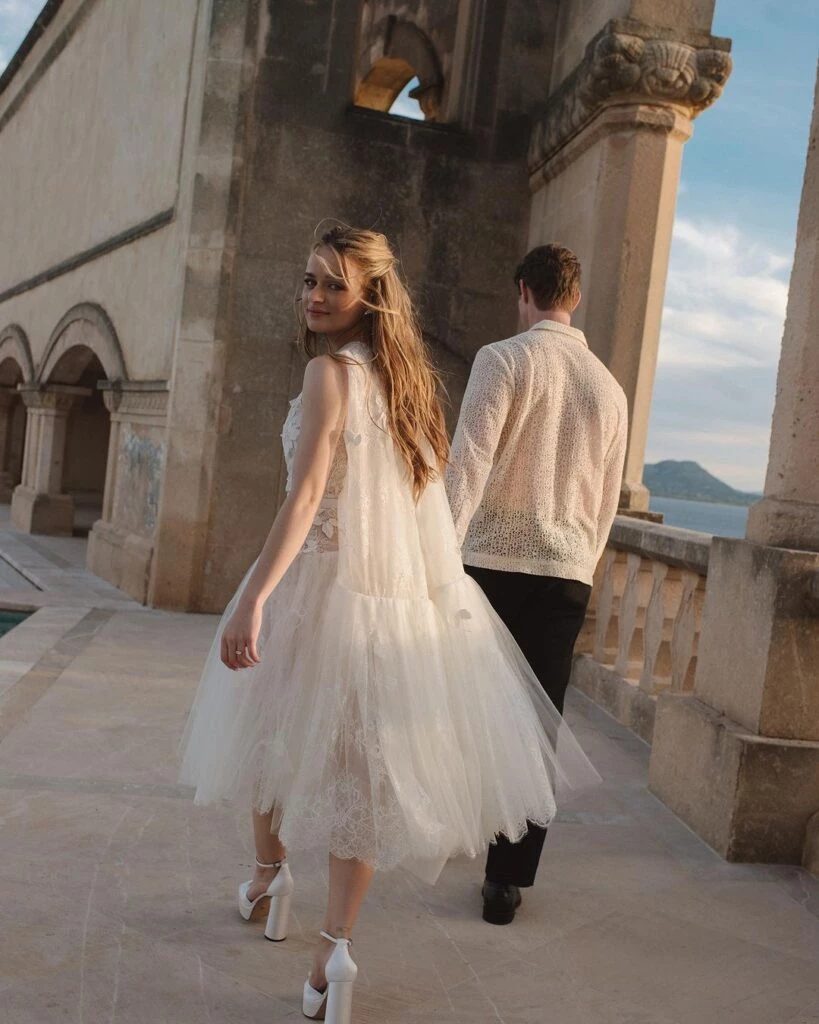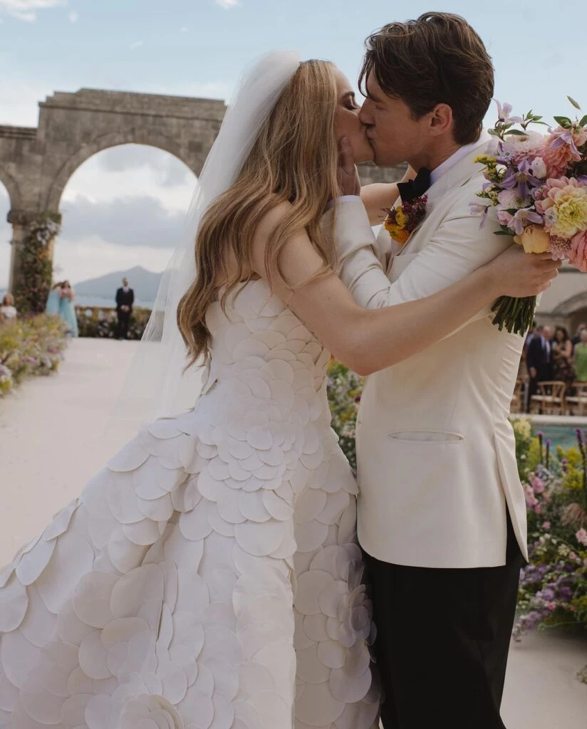 Para el tercer vestido que aparece en varias fotos junto a Piet, la actriz llevó uno de encaje hasta la rodilla y un detalle de capa, con flores que cubrían su espalda. Finalmente, hubo un cuarto vestido que no fue revelado en las imágenes."Supe instantáneamente que eran perfectos", reveló la joven, respecto a sus looks elegidos.