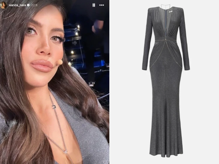El impactante vestido elegido por la mediática es de la firma italiana Elisabetta Franchi, valuado en 900 dólares. La prenda está compuesta en lúrex con un pronunciado escote y una falda drapeada en las caderas que termina en un corte sirena. Además, cuenta con una cadena en el cuerpo con dijes de metal dorado que adorna el escote y se cierra en la cintura.