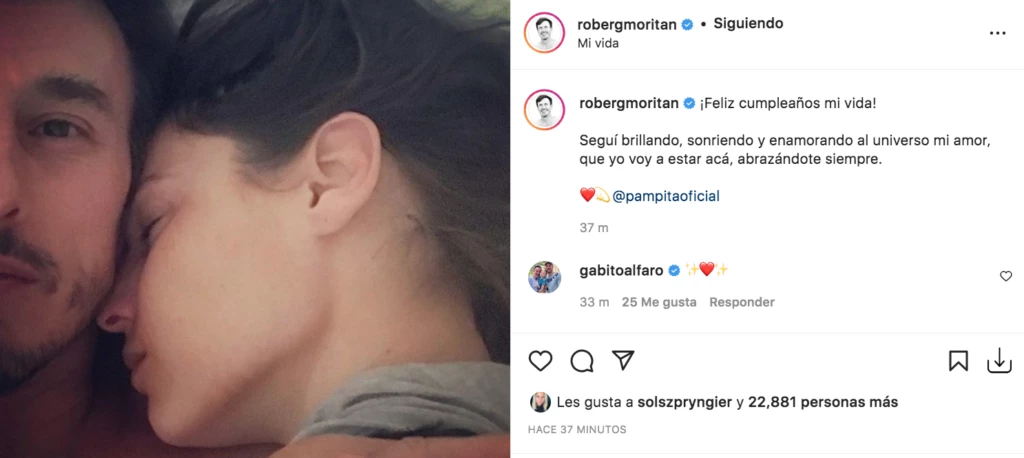 Sin embargo, fue este mismo lunes cuando Roberto García Moritán la sorprendió con un posteo súper romántico. "¡Feliz cumpleaños mi vida! Seguí brillando, sonriendo y enamorando al universo mi amor, que yo voy a estar acá, abrazándote siempre. ❤️💫 @pampitaoficial", le escribió.