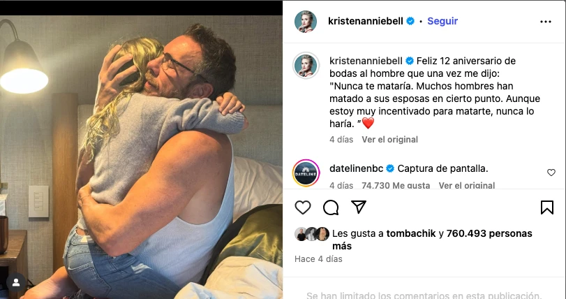 Kristen Bell es una actriz estadounidense, reconocida por sus papeles en "The Good Place" y "Nadie quiere esto" y se caracteriza por su sentido del humor. Sin embargo, durante el aniversario con su esposo Dax Shepard, su estilo irónico llegó demasiado lejos al punto de recibir fuertes críticas.