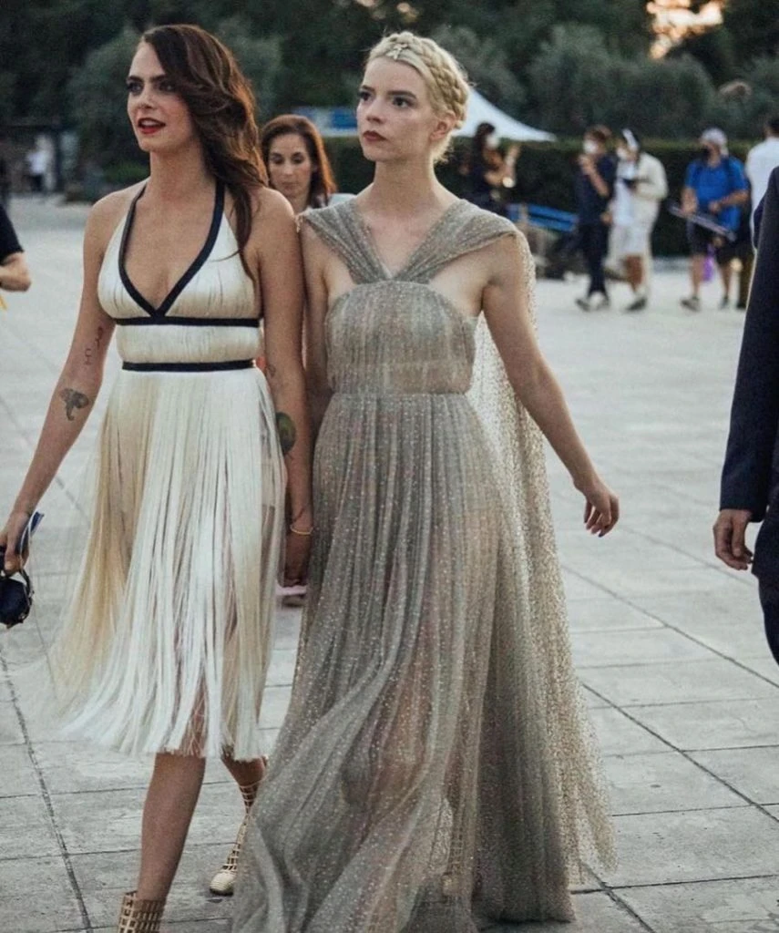 Acudieron muchos rostros conocidos y las más fieles amigas de la marca que, por supuesto, como buenas embajadoras de Dior, lucieron en primera fila del 'show' los looks de esta colección primavera-verano. Entre ellas, la modelo Cara Delevingne, con un vestido de seda blanco con flecos y Anya Taylor-Joy, que lució un vestido de tul bordado. Las dos celebridades tuvieron la particularidad de llevar el mismo calzado, razón por la que decidieron fotografiarse juntas haciendo hincapié en que coincidir con otra persona no tiene que ser una situación 'embarazosa', ya que 'solo denota que tienes buen gusto', en palabras de la propia Cara, como más tarde publicó en Instagram.