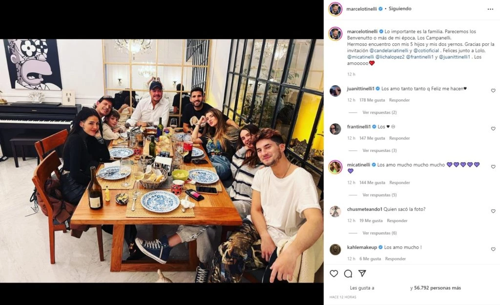 A días de contar que está soltero, Tinelli volvió a mostrarse activo en su cuenta de Instagram con un particular posteo. "Lo importante es la familia. Parecemos los Benvenutto o más de mi época Los Campanelli", escribió el presentador junto a una foto donde se lo ve disfrutando de una cena junto a sus cinco hijos, Candelaria, Micaela, Juana, Francisco y Lorenzo, y sus dos yernos, Coti Sorokin y Lisandro López.