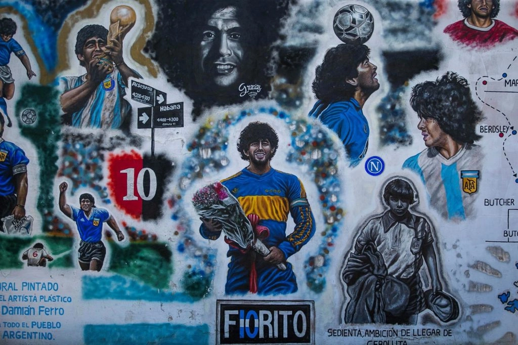 Desde que el astro del fútbol fue enterrado en esta zona, las calles aledañas se llenaron de murales del excampeón del mundo con Argentina en México 1986.