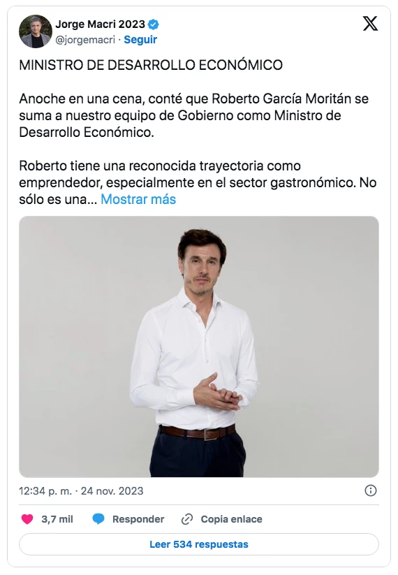 Sin embargo, este viernes Macri confirmó en las redes a su nuevo ministro. "Me honra su incorporación porque estoy convencido que las cualidades que el embandera serán muy útiles para potenciar a aquellos que eligen nuestra Ciudad para emprender, crecer, trabajar y prosperar", escribió en la red social X (exTwitter).