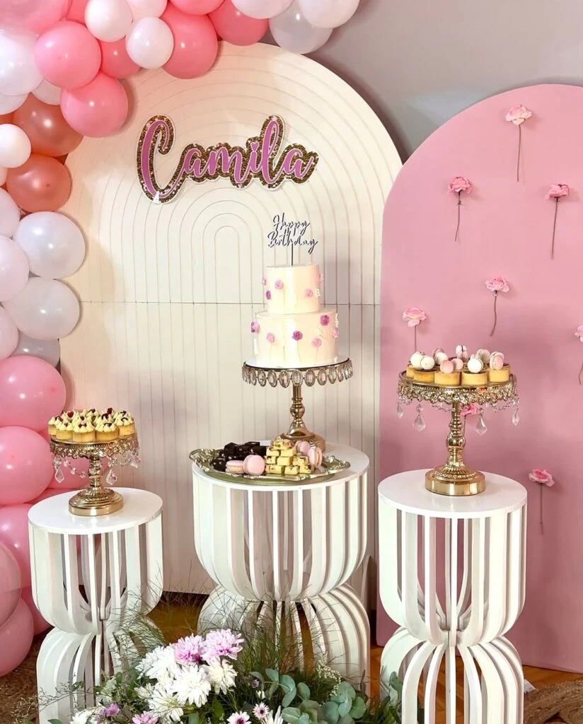 Había una guirnalda de globos en rosa y blanco que rodea parte del fondo, aportando volumen, color y una vibra festiva ideal para fotos.