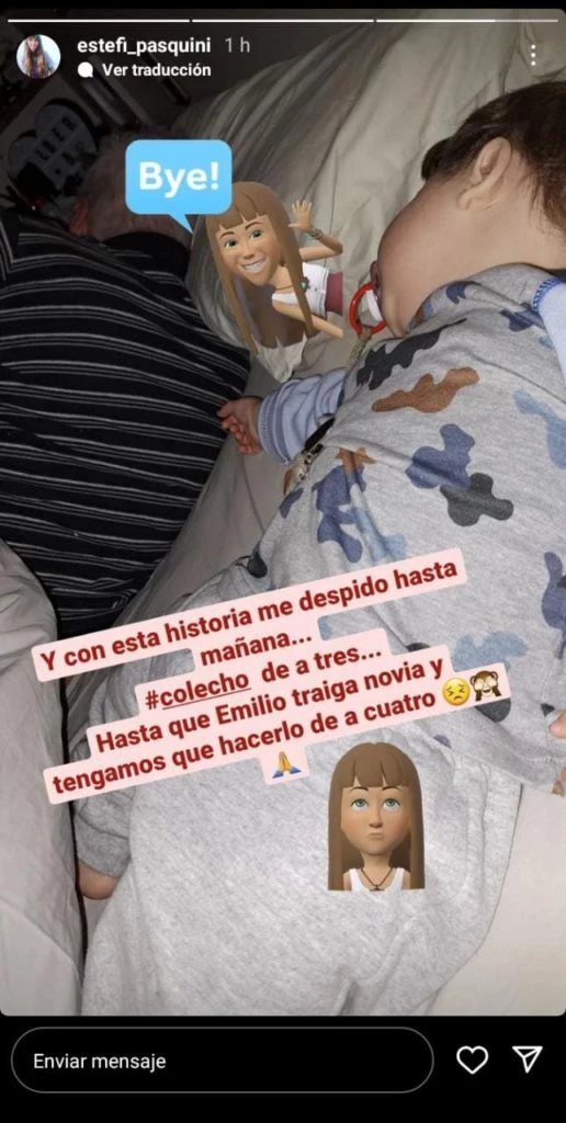 Este jueves, Estefanía compartió una postal de su hijo durmiendo junto a Cormillot y enterneció a sus seguidores. "Y con esta historia me despido hasta mañana. Colecho de a tres... hasta que Emilio traiga novia y tengamos que hacerlo de a cuatro", escribió la nutricionista, junto a la dulce foto, que subió a su Instagram.