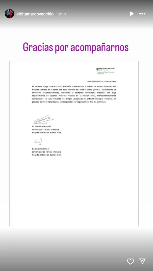 "El paciente Jorge Ernesto Lanata continúa internado en la unidad de terapia intensiva Del Hospital Italiano de Buenos Aires con leve mejoría del cuadro clínico genereal", decía el parte médico.