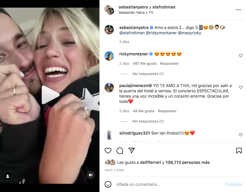 Pues bien, fueron dos los posteos de Stefi -que hace pocos días brilló en la Gala de los 100 años de Para Ti-, que hicieron ilusionar a sus seguidores. Uno fue el que dice "Amo a estos 2... digo 3", donde aparece la influencer junto a su esposo, frase que también uso Sebastián Yatra, amigo de la pareja, para referirse al hijo mayor de Ricardo Montaner y su mujer.