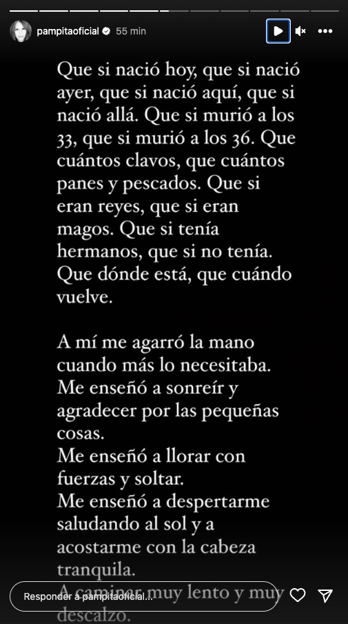 "Que si nació hoy, que si nació ayer, que si nació aquí, que si nació allá. Que su murió a los 33, que si murió a los 36. Que cuántos esclavos, que cuántos panes y pescados (...)", así comenzó el mensaje que publicó Pampita este domingo a la tarde.