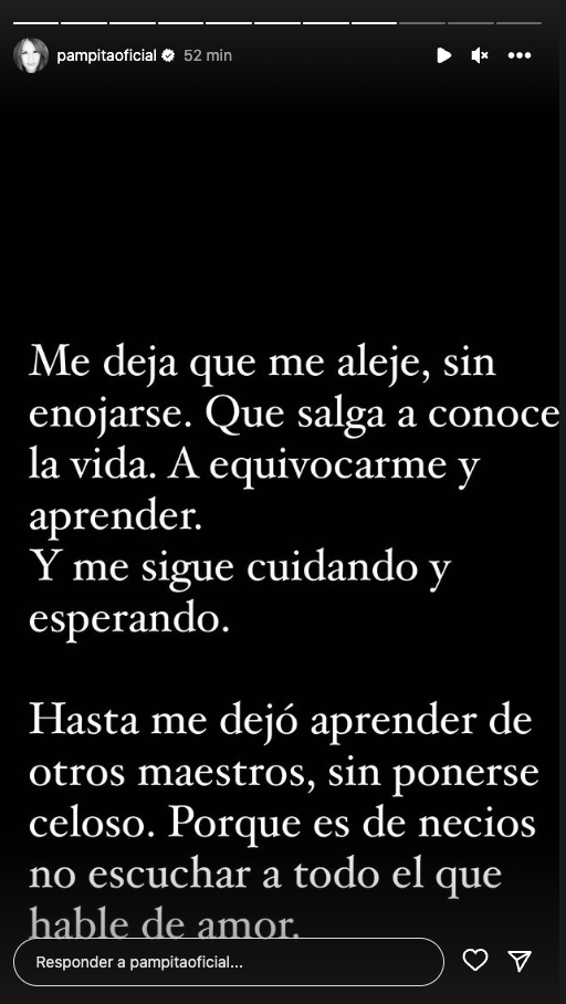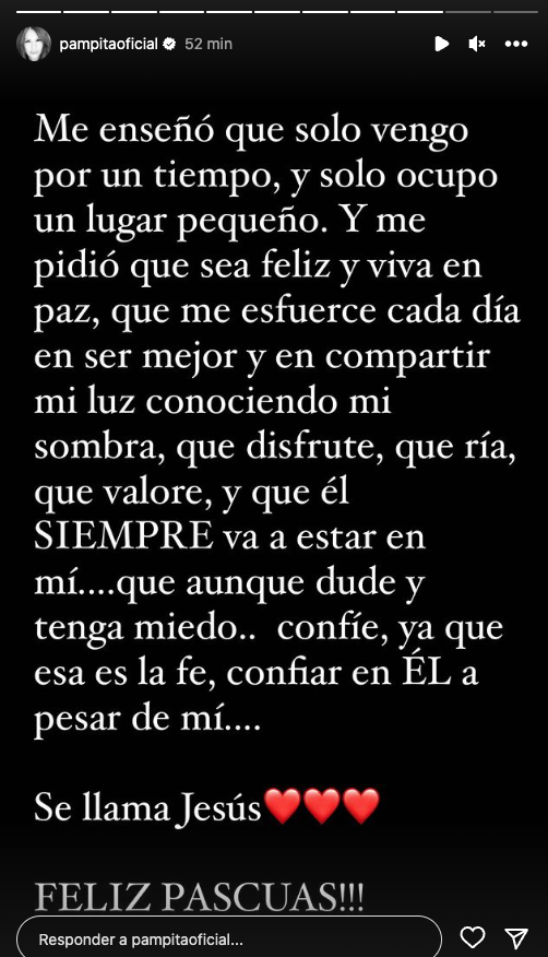Y concluyó de esta forma: "Me enseñó que solo vengo por un tiempo, y solo ocupo un lugar pequeño. Y me pidió que sea feliz y viva en paz, que me esfuerce cada día en ser mejor y en compartir mi luz conociendo mi sombra, que disfrute, que ría, que valore, y que él siempre va a estar en mi... que aunque dude y tenga miedo, confíe ya que esa es la fe, confiar en él a pesar de mi. Se llama Jesús. Felices Pascuas".