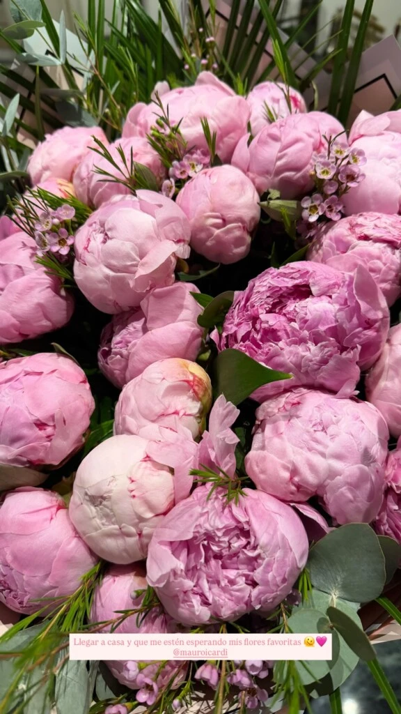 Pero las buenas vibras no terminaron ahí. Al regresar a casa, la esperaban flores rosas, sus favoritas, enviadas por Mauro Icardi. “Llegar a casa y que me estén esperando mis flores favoritas”, escribió en sus redes, mostrando una postal que destiló ternura.
