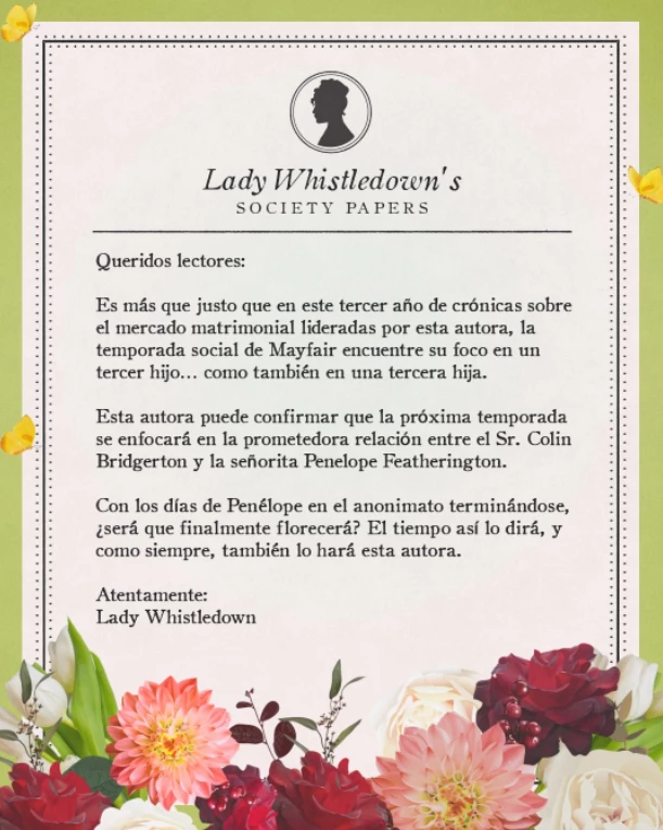 Asimismo, publicó el comunicado de Lady Whistledown con la misma noticia: "Queridos lectores. Es más que justo que en este tercer año de crónicas sobre el mercado matrimonial lideradas por esta autora, la temporada social de Mayfair encuentre su foco en un tercer hijo...como también en una tercera hija".