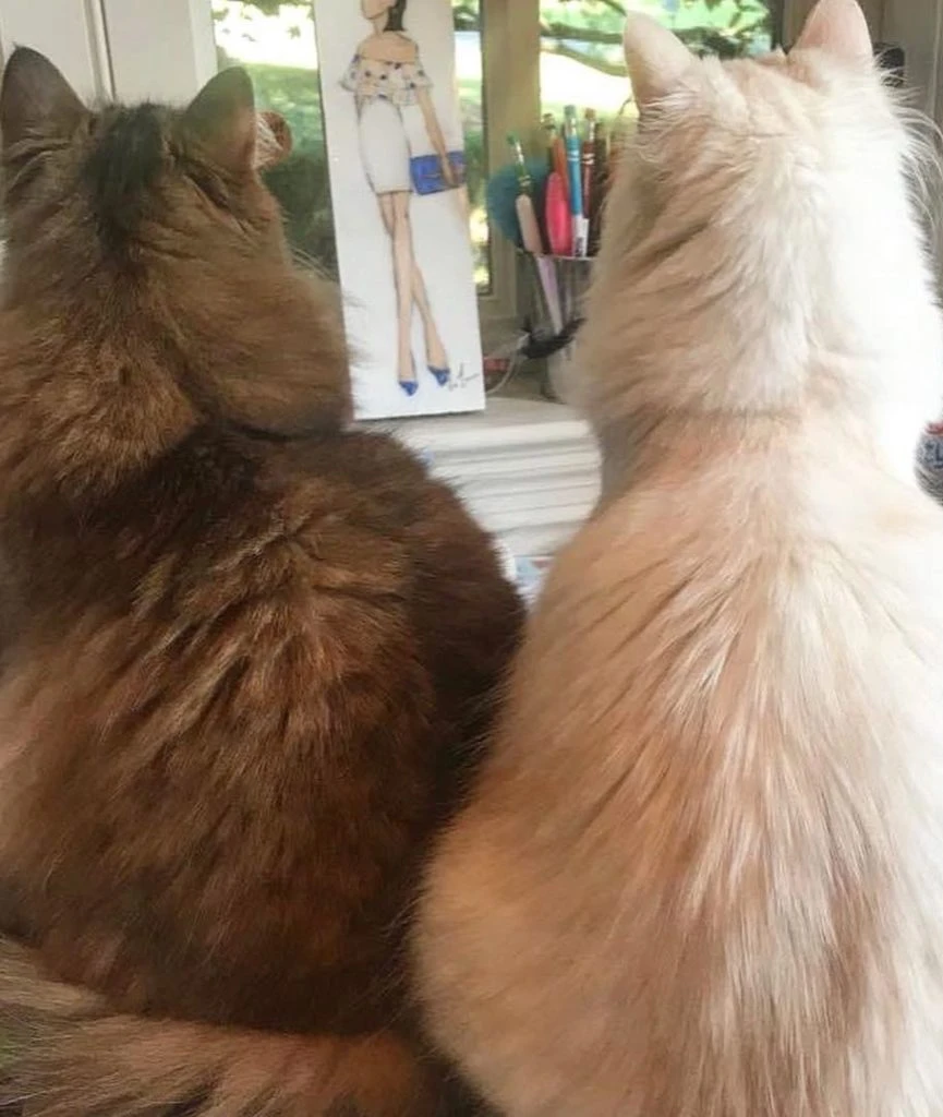 Los gatitos son protagonistas una vez más, dejando ver otro de los sectores del estudio: una ventana que muestra el jardín.