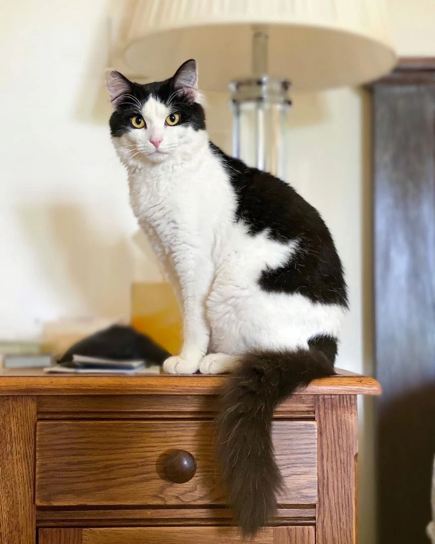 En la imagen, el gatito fue captado en la mesa de luz del dormitorio principal, revelando parte del mobiliario de la habitación, incluyendo una cama con respaldo de madera y una lámpara de noche con base acrílica y pantalla en tonos crema.