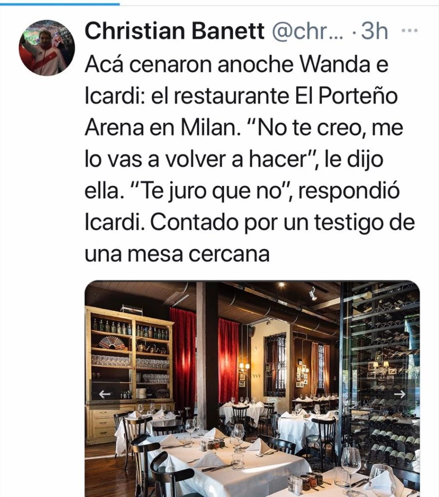 Anoche, ambos subieron historias comiendo en un restó que se llama El Porteño Arena -y están en Milán- y, obviamente, quedó más que en claro que se encontraban cenando en familia. Sin embargo, hoy el Jefe de Redacción del sitio web, Christian Banett, subió un tweet con información exclusiva sobre lo que habría pasado en la velada de ayer.