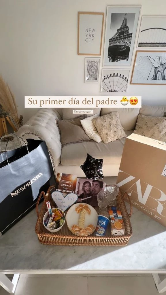 Presentado en una bandeja de mimbre y con la foto donde aparecen ambos con el test de embarazo positivo, este desayuno contó con café, frutas, yogurt, jugo, golosinas y un libro de Crianza para Principiantes. "Feliz primer día papá. Te amamos", escribió la joven, quien se muestra muy emocionada ante su maternidad.