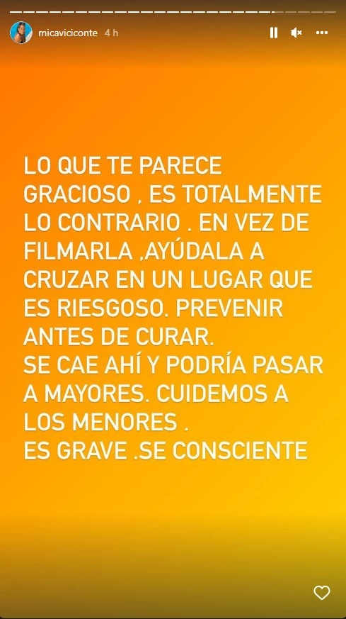 "Lo que te parece gracioso, es totalmente lo contrario. En vez de filmarla, ayudala a cruzar un lugar que es riesgoso. Prevenir antes de curar”, escribió en su red social tras ver el posteo.