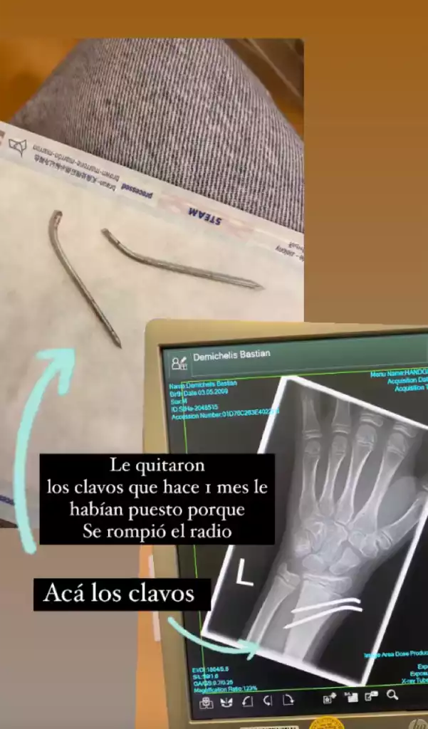 Luego mostró la radiografía de la mano de Bastián y los clavos que le extrajeron: "Le quitaron los clavos que hace un mes le habían puesto porque se rompió el radio", aseguró con la imagen de la radiografía