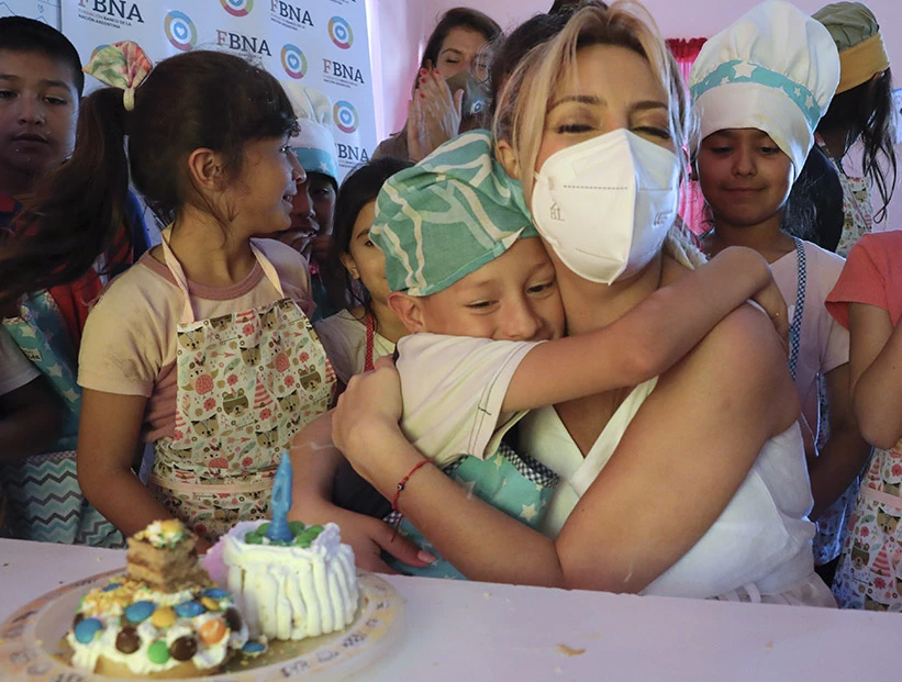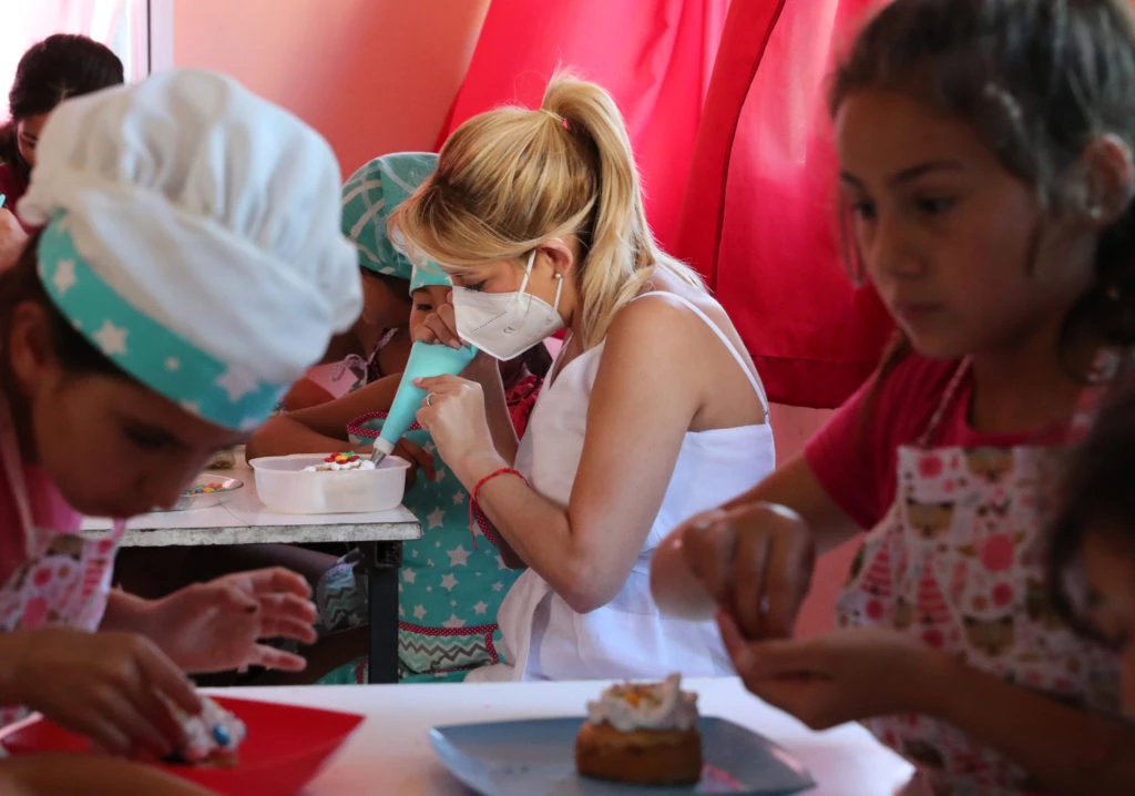 Yáñez participó de una clase de pastelería junto los menores y se interiorizó acerca de la dinámica de trabajo de Esperanza Kilme que ofrece almuerzo, merienda, clases de apoyo escolar y talleres de cocina. Por su visita, le entregaron un regalo muy especial para felicitarla por su embarazo.