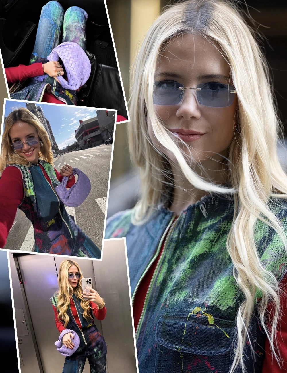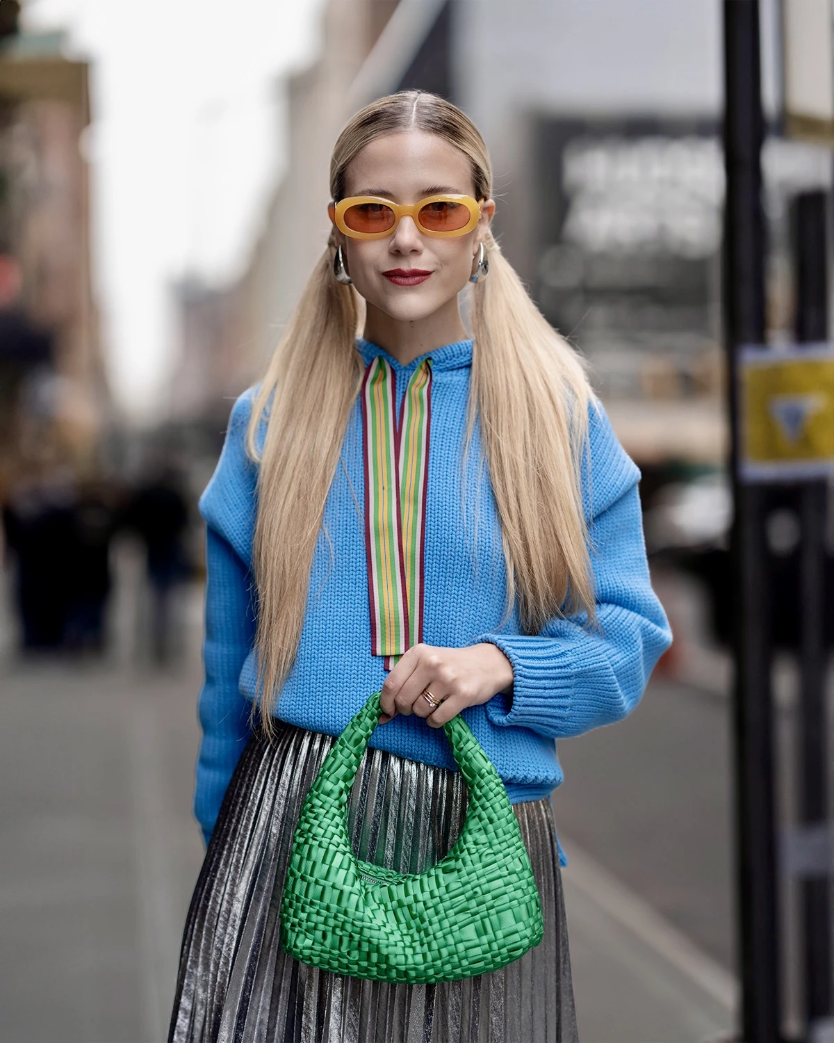 Comencé el día con el desfile de Carolina Herrera, seguido de la presentación del diseñador de knitwear del momento, Zankov. Al tener en mi poder un sweater de la colección de Zankov, decidí que esta prenda sería el punto de partida para mi look. Inspirada por sus vibrantes tiras coloridas y el movimiento de las líneas longitudinales, opté por una pollera plisada plateada que reflejaba los tonos presentes en el sweater. La combinación de colores era una explosión de creatividad: lentes de color amarillo oscuro, aros plateados, cartera verde y zapatos azules.