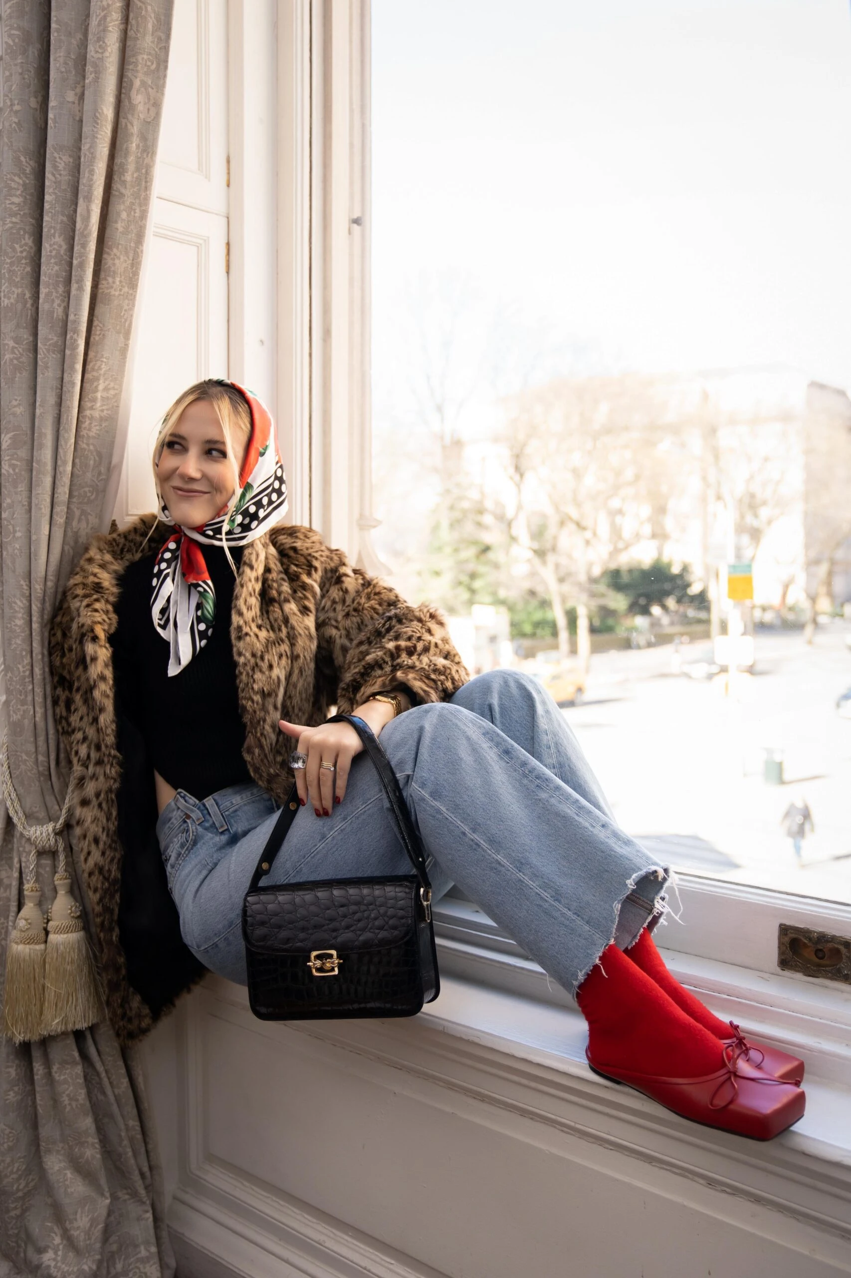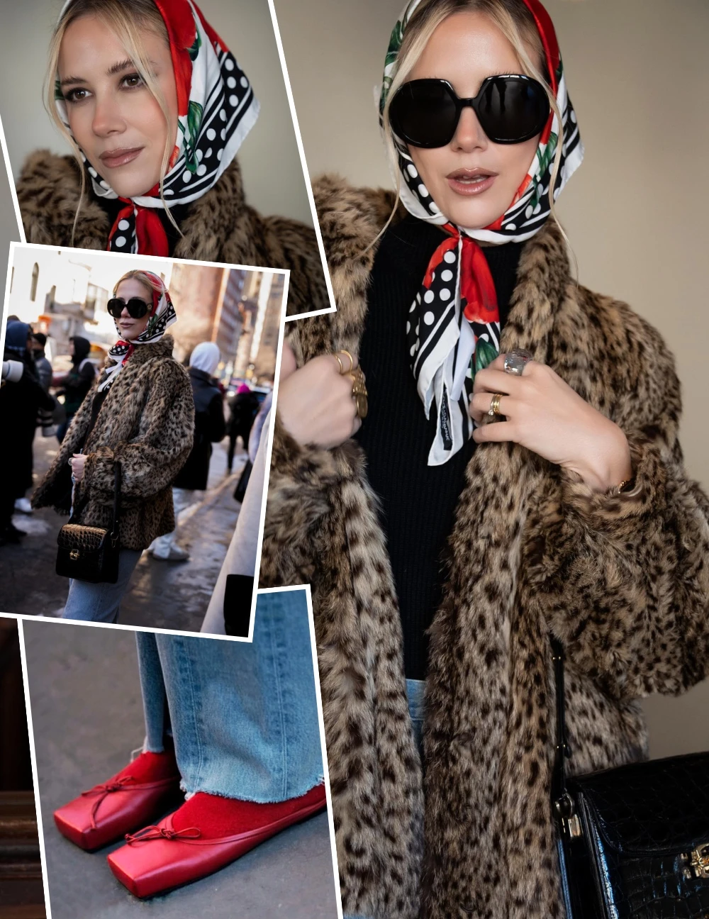 Quise añadir un toque de color y sofisticación, y opté por mis icónicas ballerinas de punta cuadrada de Jacquemus en un vibrante tono rojo, un detalle que resaltaba con el gris de la jungla de cemento, como muchos llaman a Manhattan. Además, decidí incorporar un pañuelo tipo 'babushka' en la cabeza, un gesto hacia la herencia cultural de la diseñadora ucraniana BEVZA y una forma de homenajear sus raíces.