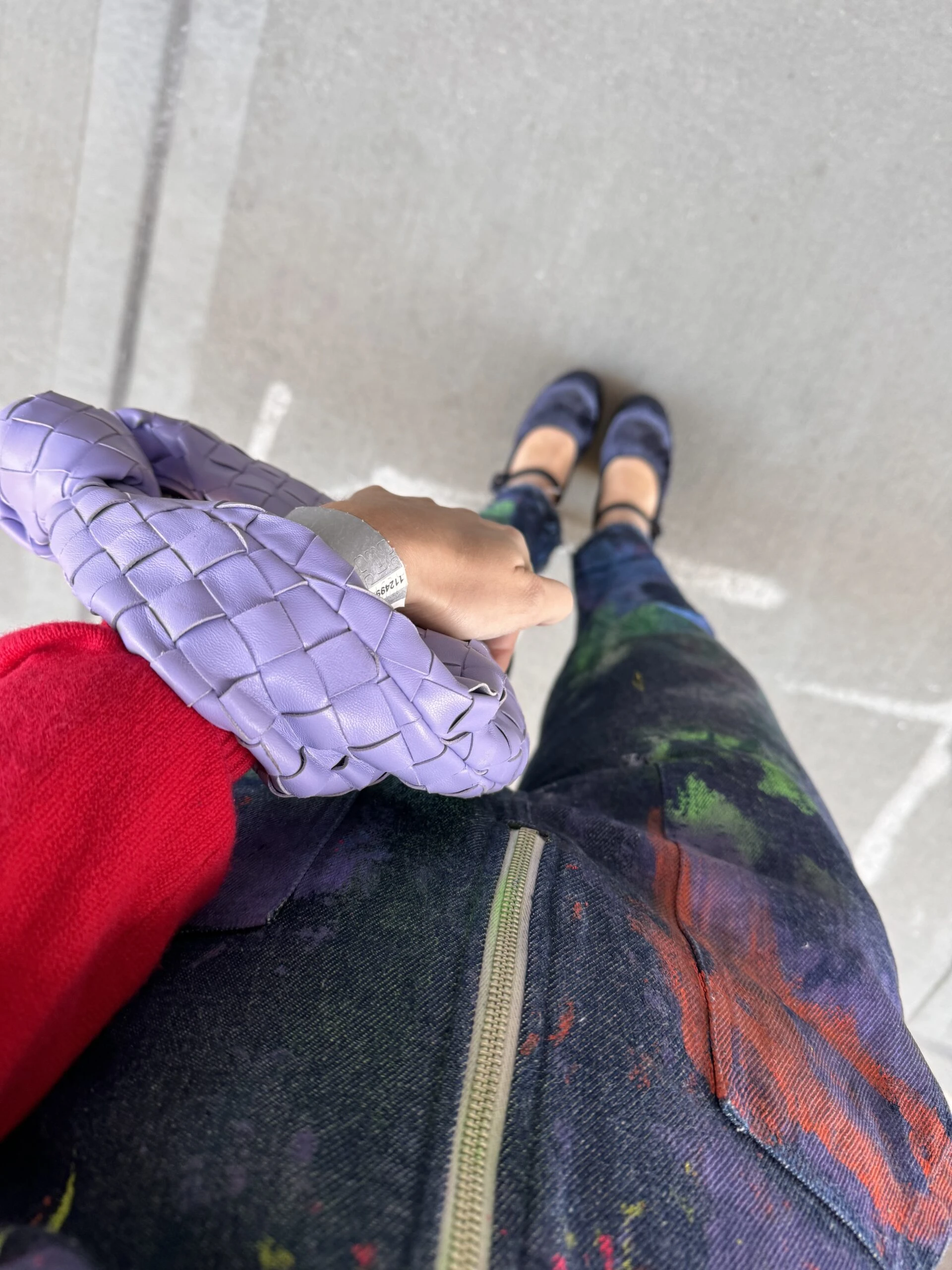 En cuanto a los accesorios, cada detalle fue pensado para elevar y completar el conjunto con estilo y sofisticación. Opté por unos llamativos zapatos de pana azul que no solo acompañaban el estilo maximalista, sino que también aportaban una dosis extra de elevación al conjunto. Los lentes azules, en perfecta sintonía con el tono del denim, y la cartera Jodie de Bottega Veneta en color lila, añadieron un toque de creatividad y originalidad al look.