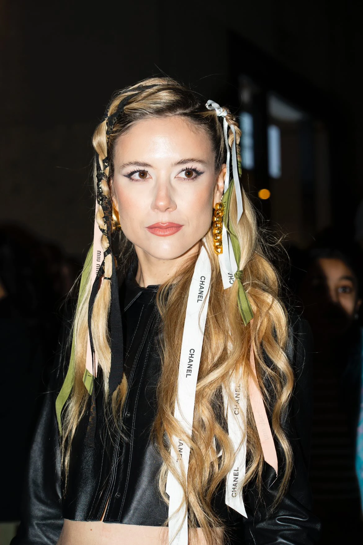 A diferencia del día anterior, decidí que el peinado sería el punto focal de mi look. Para ello, recurrí a Malena Vayo, mi aliada en la creación de maquillajes y peinados que complementan mis outfits para estas ocasiones. Inspirada por la tendencia del maximalismo, decidí incorporar cintas que había guardado de envoltorios de marcas de lujo. La armonía entre las cintas de Dior, Gucci, Chanel, Miu Miu y Celine en mi peinado evocaba una estética de "más es más", que se alineaba perfectamente con el espíritu de la ocasión.