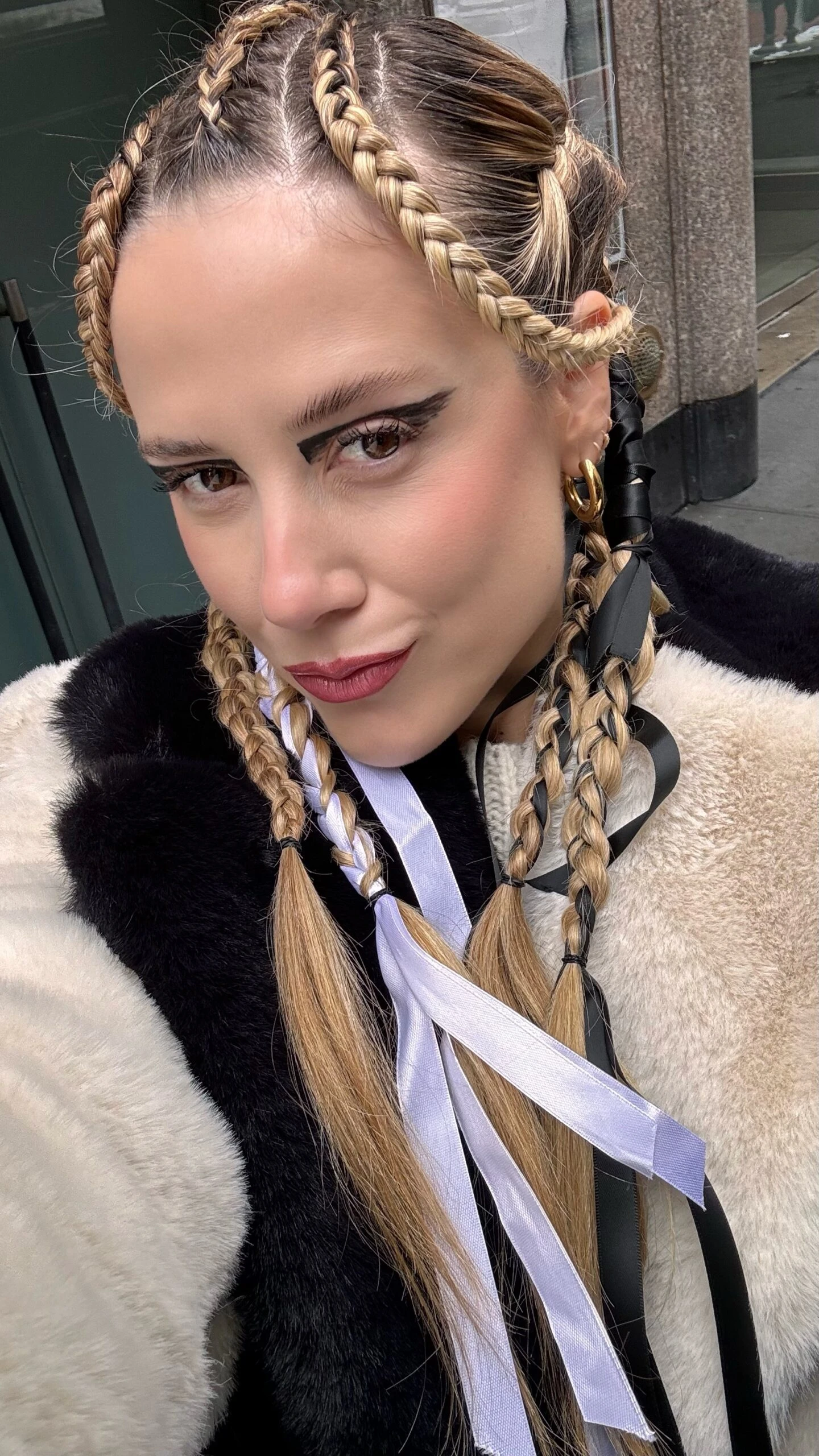 En cuanto al peinado y el maquillaje, busqué inspiración en las “boxer braids”. Le envié a Malena, mi glam artist, referencias visuales de trenzas intrincadas y maquillajes con toques grunge. Malena elevó la apuesta incorporando cintas blancas y negras al peinado, creando una mezcla única de fortaleza y valentía. El maquillaje fue una interpretación libre de mis referencias visuales, resaltando mi rostro con un toque de dramatismo y originalidad.