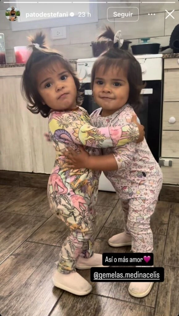 Las gemelas de un año reciben todo el afecto de sus seres queridos en este contexto tan sensible. En las últimas horas, Pato Destefani, madre de Julieta Poggio, compartió una postal junto a las pequeñas, mostrándolas divertidas y abrazadas con enteritos estampados. “Así o más amor”, escribió emocionada en la publicación.