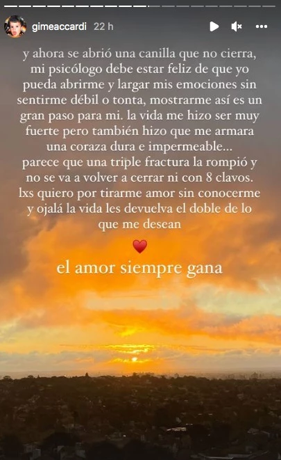 Y allí mismo agregó: "la vida me hizo ser muy fuerte pero también me hizo que me armara una coraza dura e impenetrable. Parece que una triple fractura la rompió y no se va a cerrar ni con ocho clavos". Además, Accardi adelantó que muy pronto volverá a los escenarios y podrá reencontrarse con su público.