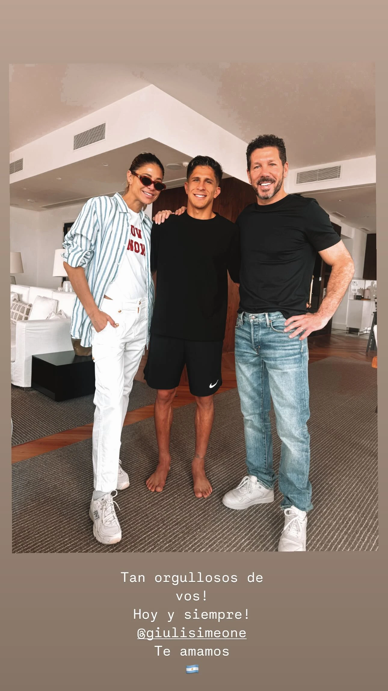 Tras el triunfo de la Scaloneta, quien compartió unas palabras de apoyo fue Carla Pereyra, actual esposa de Diego Simeone. "Tan orgullosos de vos. Hoy y siempre. Te amamos", le escribió la empresaria junto a una foto donde están los tres juntos. Además, publicó otra imagen donde padre e hijo sonríen muy emocionados.