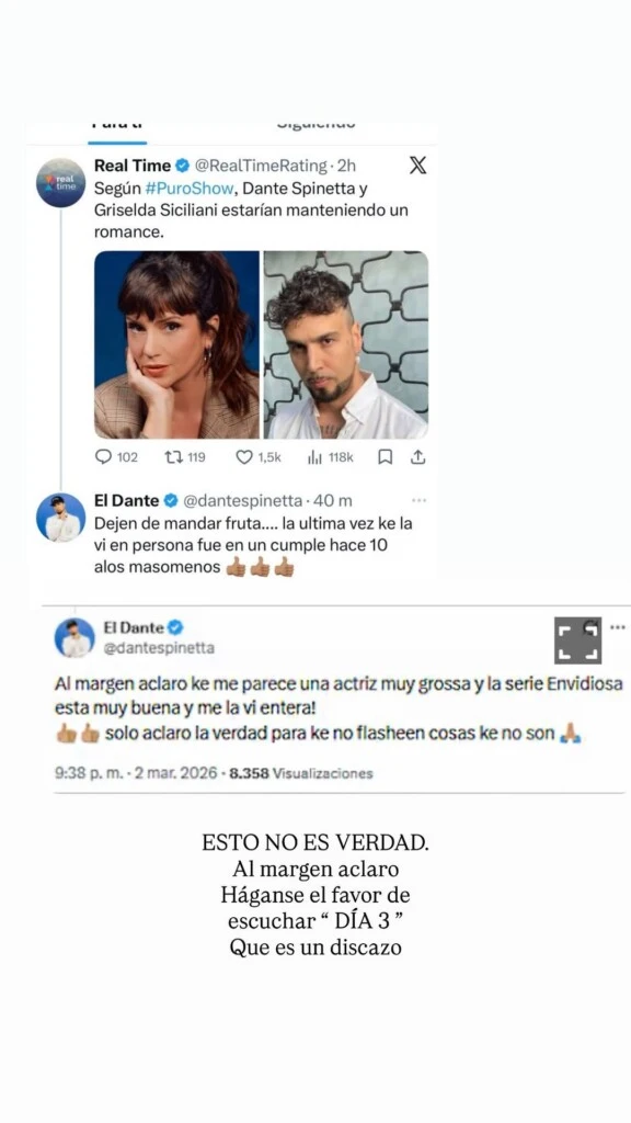 El primero en negar el vínculo que habían comunicado en el programa "Puro Show" fue Spinetta. “Dejen de mandar fruta… la última vez que la vi en persona fue en un cumple hace 10 años más o menos. Al margen aclaro que me parece una actriz muy grosa y la serie Envidiosa está muy buena y me la vi entera. Solo aclaro la verdad para que no flasheen cosas que no son", expresó vía X.