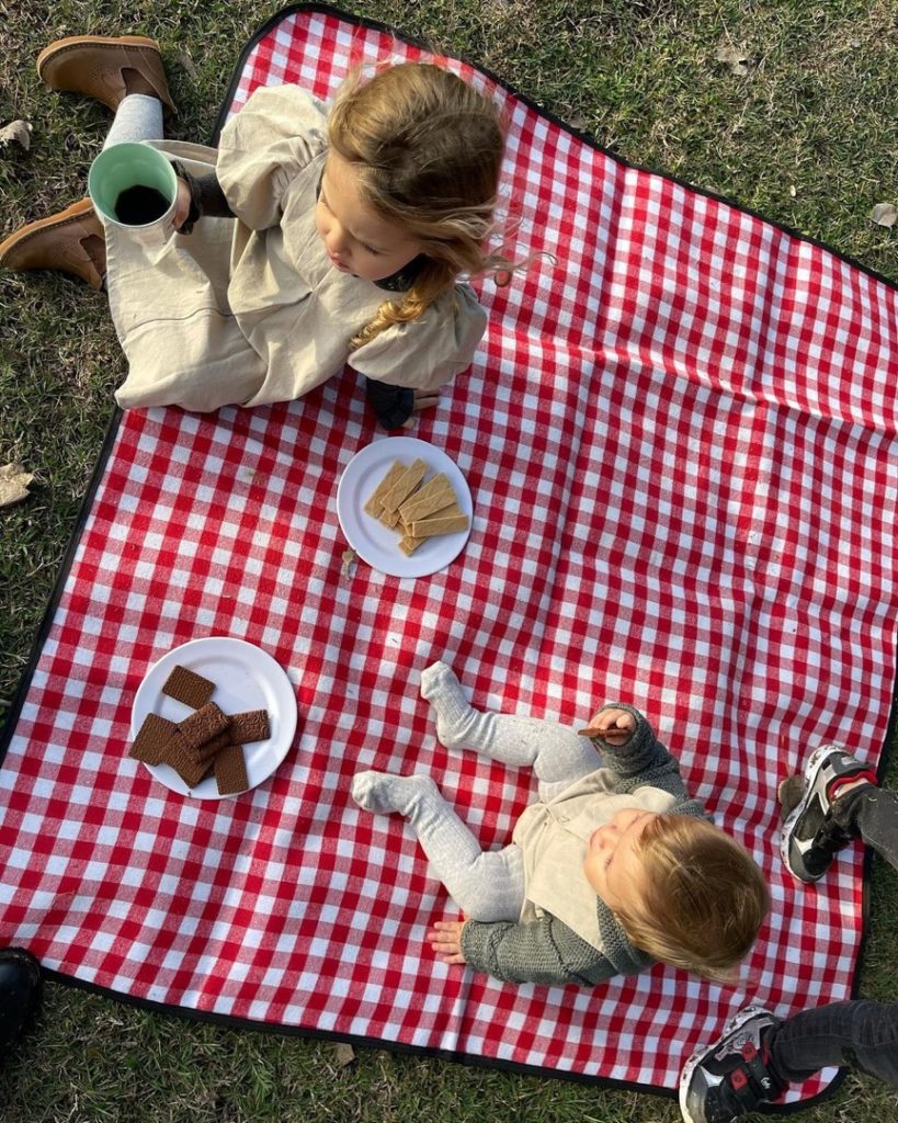 Los chicos se sentaron sobre un mantel con estampa a cuadros en rojo y blanco para merendar y comer galletitas.