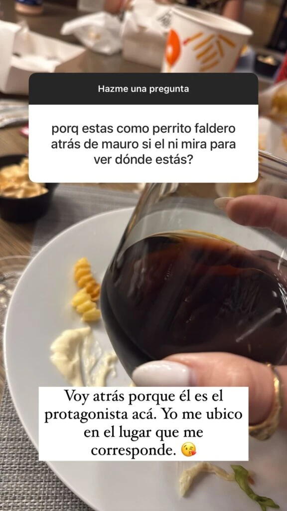 "¿Tus hijos le dicen papá a Mauro?", decía otra duda, a lo que la cantante dijo que no. "¿Por qué estás como perrito faldero atrás de Mauro si él ni mira para ver donde estás?", preguntó otra. "Voy atrás porque él es el protagonista acá. Yo me ubico en el lugar que me corresponde", contestó.