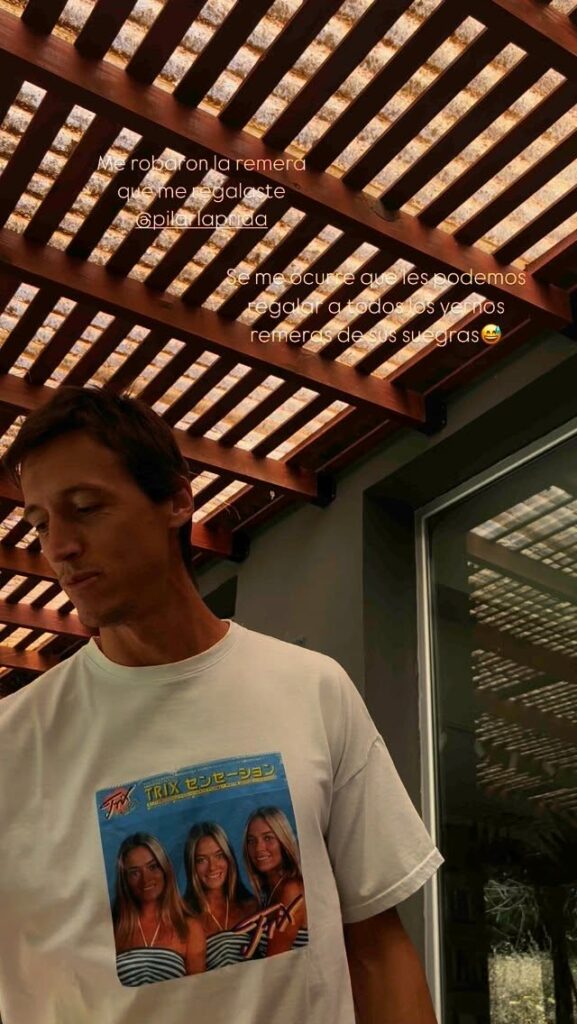 "Me robaron la remera que me regalaste. Se me ocurre que le podemos regalar a todos los yernos remeras de sus suegras", expresó Zavaleta. En efecto, su pareja aparece con una remera blanca con una imagen de las Trillizas de Oro.