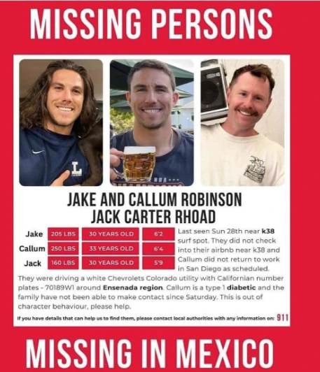 Jake, Callum y Rhoad fueron vistos por última vez surfeando y acampando a lo largo de la costa mexicana, al sur de Ensenada, el 27 de abril.