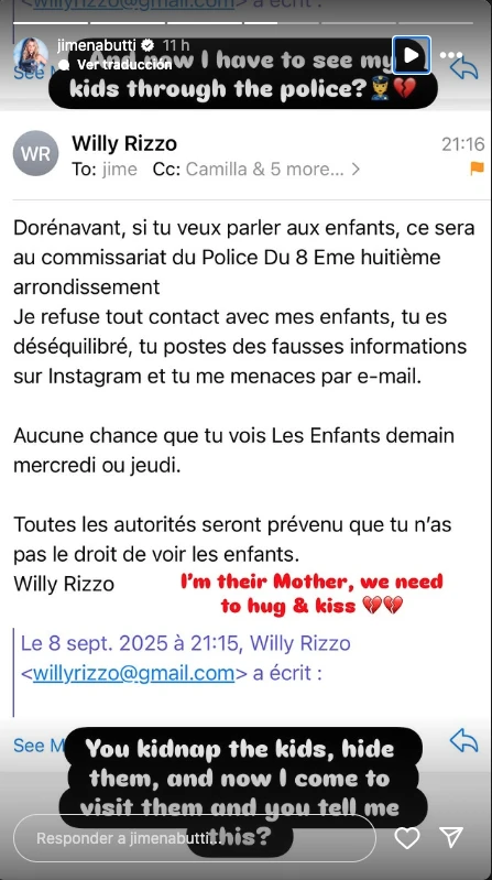 La modelo, que actualmente reside en Ibiza, compartió con sus más de 172 mil seguidores una serie de fotos y mensajes donde acusa a su exmarido, el decorador y desarrollador inmobiliario francés Willy Rizzo, de no permitirle ver ni hablar con los chicos, quienes se encontraban de vacaciones con él en París y debían regresar a España para comenzar el ciclo escolar.