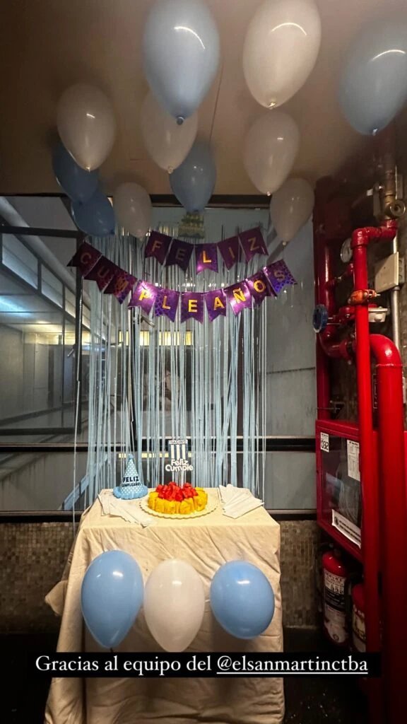 El espacio fue decorado con los colores de la albiceleste y a su vez con los tonos de Racing Club, equipo del que Furriel es fanático. Con torta, gorros y globos en celeste y blanco, el elenco y el equipo de producción lo saludó con calidez y emoción.