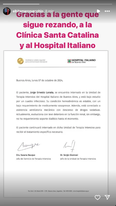 Y como en otras oportunidades, Marcovecchio se dirigió a sus seguidores al postear el informe. "Gracias a la gente que sigue rezando", comenzó diciendo la abogada y luego también agradeció a las clínicas "a la Clínica Santa Catalina y al Hospital Italiano", completó.