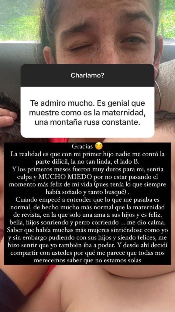 A lo que Juana respondió tan vulnerable como sincera, como siempre: "La realidad es que con mi primer hijo nadie me contó la parte difícil, la no tan linda, el lado B. Y los primeros meses fueron muy duros para mi, sentía culpa y miedo por no estar viviendo el momento más feliz de mi vida."