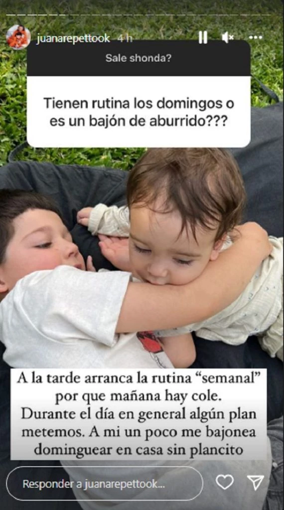 A su vez, Repetto sigue cronogramas estrictos para cada uno de los niños pero prefiere tomarse los findes más relax, cuando no hay escuela. "A la tarde arranca la rutina semanal porque mañana hay cole. Durante el día general algún plan metemos. A mí un poco me bajonea dominguear un poco sin pancito", expresó.