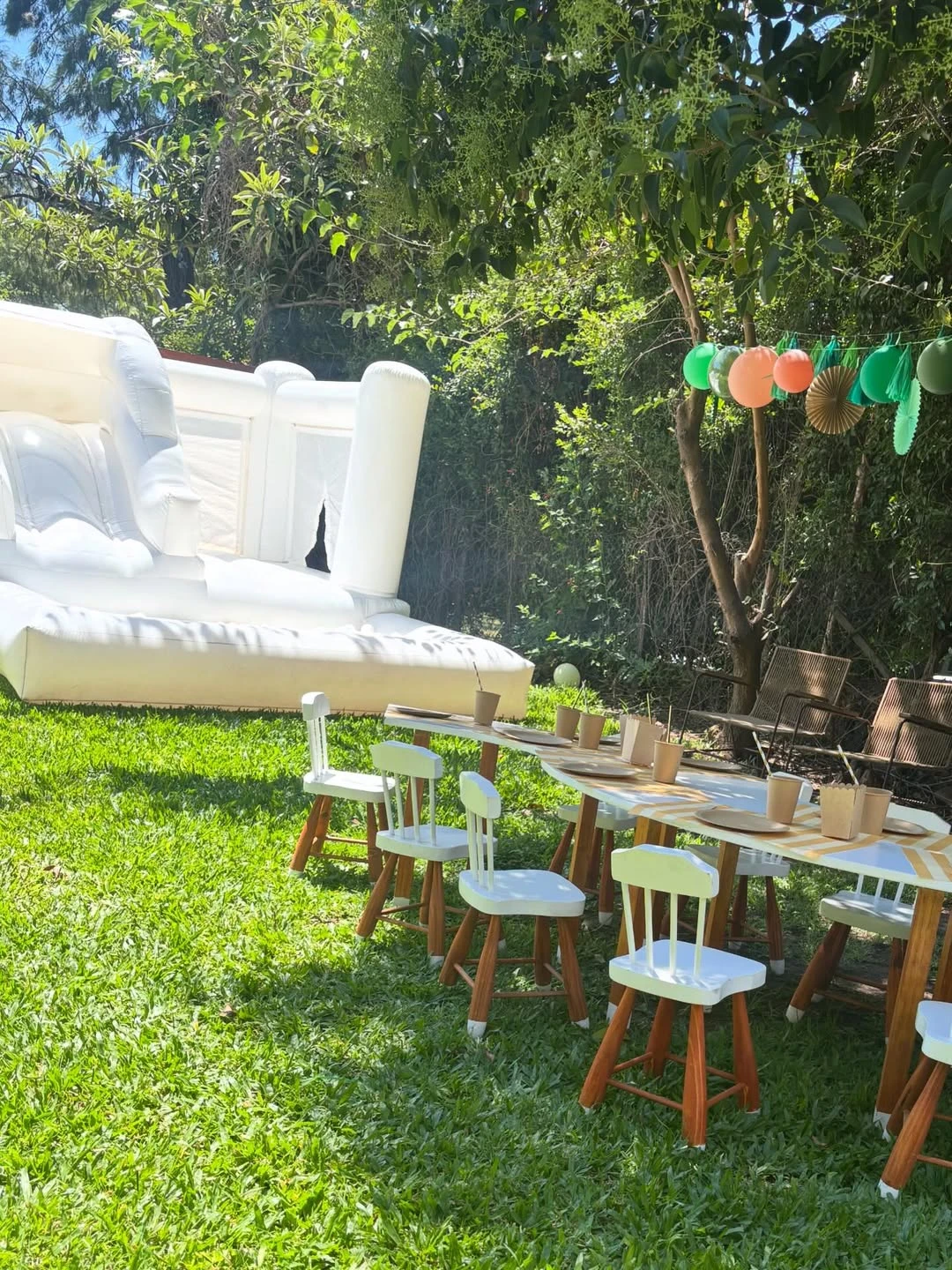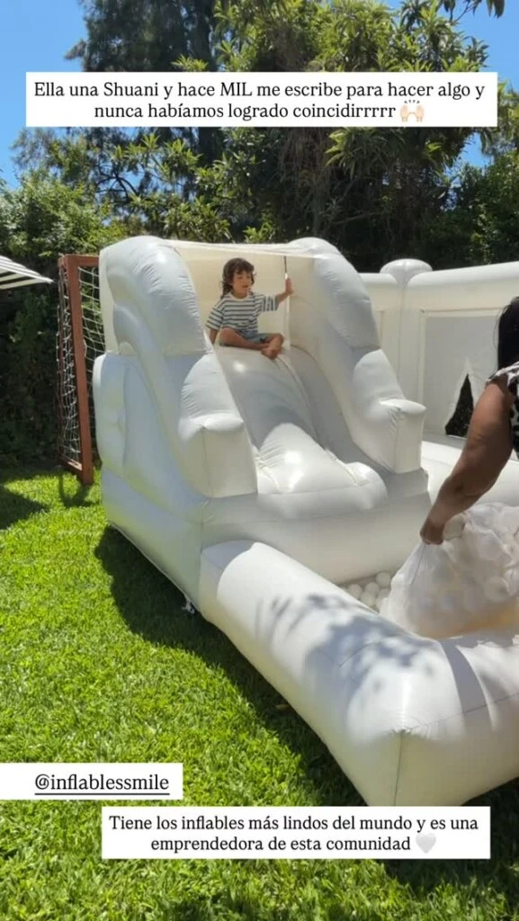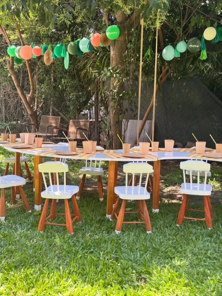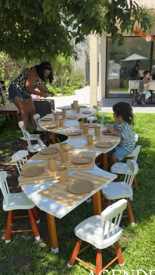 En las imágenes se pueden ver a sus hijos Toribio y Belisario ayudando en la decoración que contó con unos globos verdes y naranjas y un estilo muy artesanal. Además, el evento incluyó un inflable grande con pelotero para que disfruten sus niños y un mobiliario muy delicado de madera para comer al aire libre.