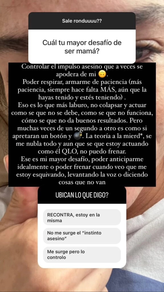 A su vez, la mujer también se animó a contar lo más difícil de ser mamá, a pesar de todo lo bueno que significa. "¿Cuál es tu mayor desafío de ser mamá?", le preguntaron. A lo que ella respondió muy sincera. "Poder respirar y armarme de paciencia, siempre me hace falta más. Eso es en lo que más laburo, no colapsar", expresó.