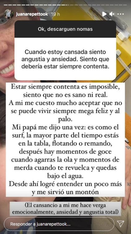 En ese sentido, hace pocas horas Juana aconsejó a otras mamás que le escribieron por Instagram y, en una de las Historias, citó una frase de su papá, Nicolás, que según explica, la ayuda mucho. "Cuando estoy cansada siento angustia y ansiedad. Siento que debería estar siempre contenta", le escribió una seguidora. Y la respuesta de Juana, muy sabia por cierto, fue la siguiente: "Estar siempre contenta es imposible, siento que no es sano ni real. A mi me cuesta mucho aceptar que no se puede vivir siempre mega feliz y al palo", comenzó.