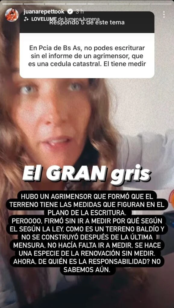 "Hay un agrimensor que midió el terreno lo que pasa es que nos dijo que cuando un terreno es baldío, no tiene la obligación de ir y medir, sino que se hace como la mensura o no sé, no me quiero equivocar de término. Es como que se renueva algo que hizo otro agrimensor antes", expresó en sus stories.