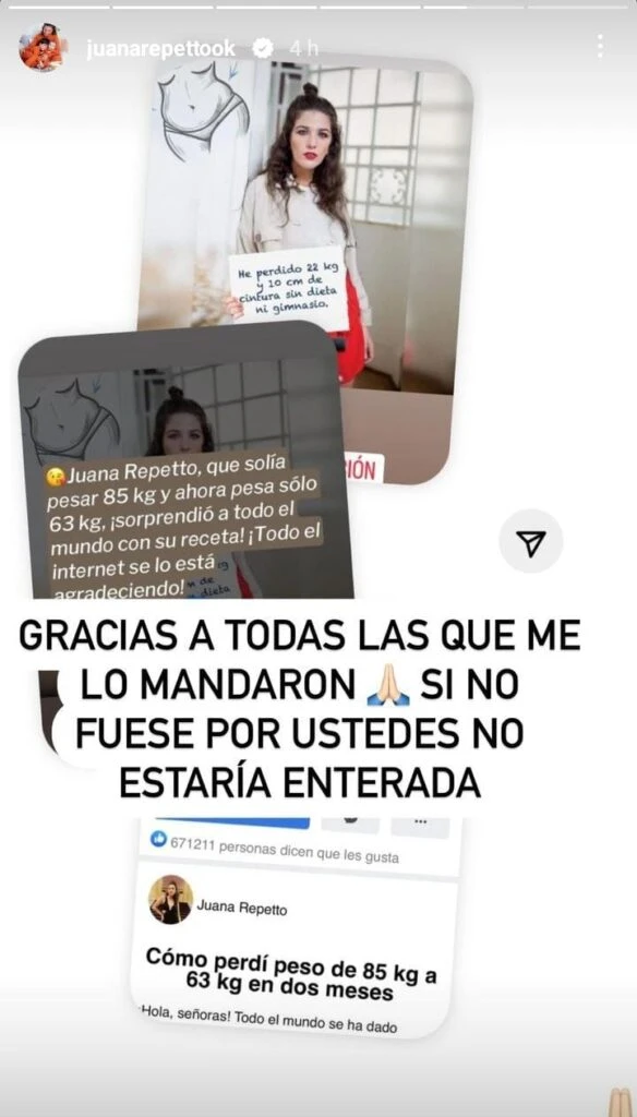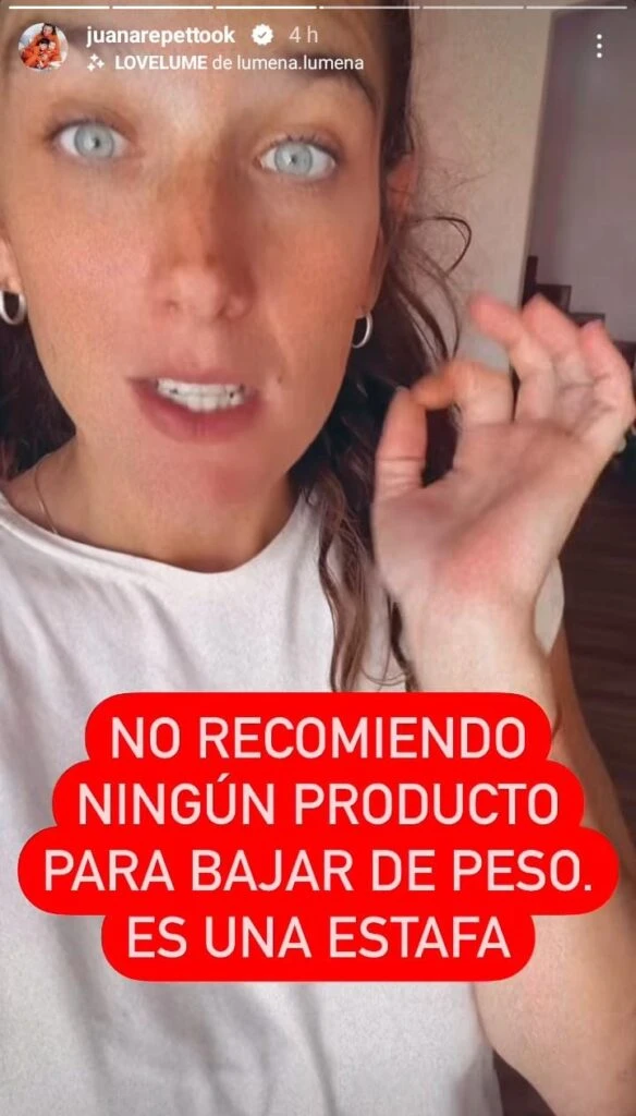 Acto seguido, Juana volvió a insistir a sus usuarios que no adquieran ningún tipo de producto de estas características, ya que está en contra de todo lo que no sea natural. "Viralicemos esto, ayúdenme a que llegue a todo el mundo. No recomiendo ningún producto ni nada que sea alimentación saludable para bajar de peso. Están usando mi cara para vender un producto. Me preocupa un montón que crean que recomiendo eso. Envíen esta historia por favor", insistió la influencer.