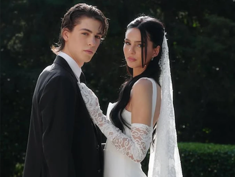 El concepto de la campaña evoca una boda contemporánea, donde lo clásico se encuentra con lo minimalista. Juana luce un vestido al cuerpo, con escote cuadrado y velo largo de encaje, mientras que Benicio lleva un traje negro clásico con corbata, en un estilo timeless que combina elegancia con frescura. La locación –un jardín con pileta y luz natural de invierno– completa la escena como un altar moderno.
